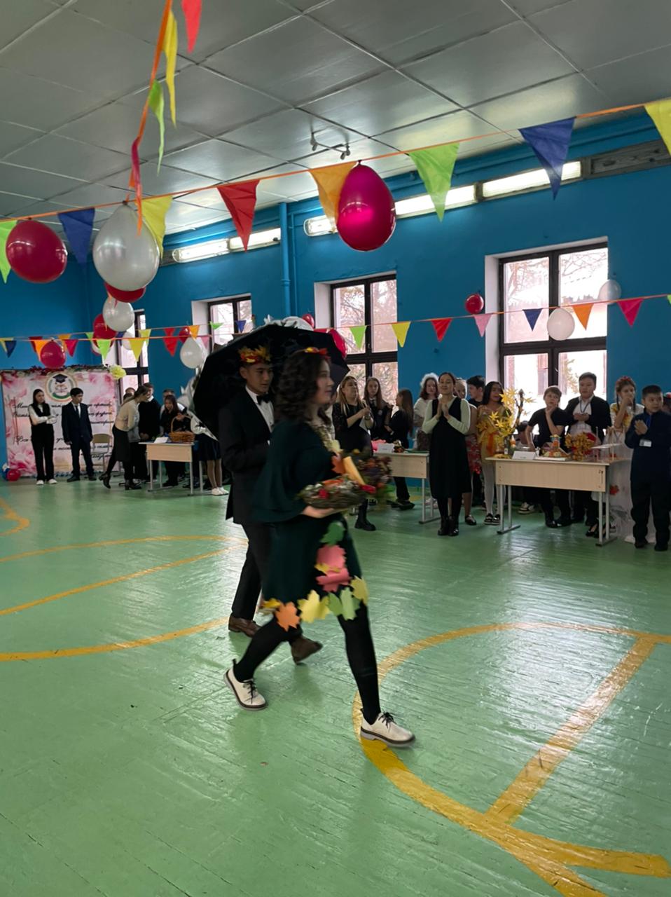 В нынешнем году ответственность за проведение «Осеннего бала» легла на учащихся Школьного Парламента. Совместно с и.о. зам. директора Акжолова Р.К. был придуман очень интересный сценарий, в котором были очень интересные конкурсы. На празднике учавствовали ученики с 1-9 классы.