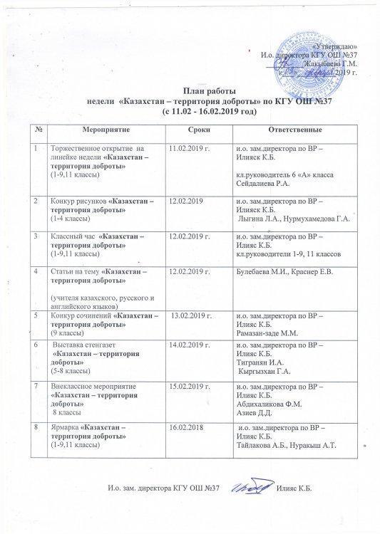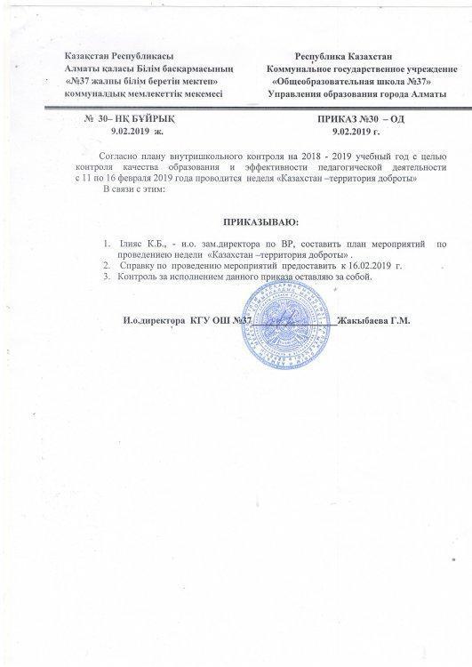 В рамках данной акции в КГУ ОШ №37 с 11.02-16.02.2019 года проводится неделя "Казахстан - территория добраты"