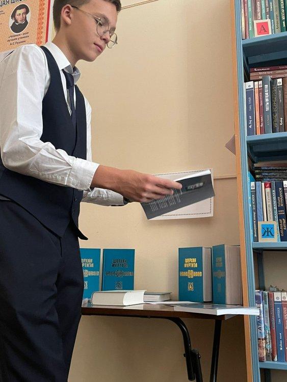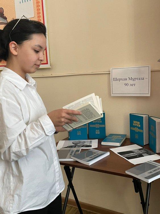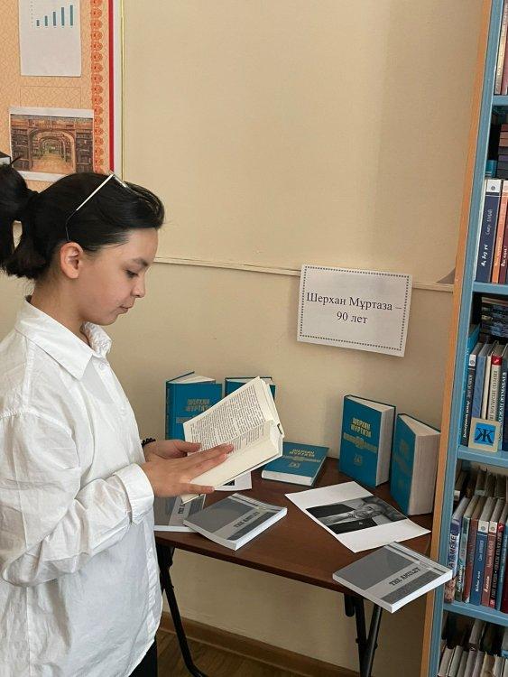В читальном зале школьной библиотеки в школе №37 проводится книжная выставка, посвященная 90-летию писателя Шерхана Мұртаза.