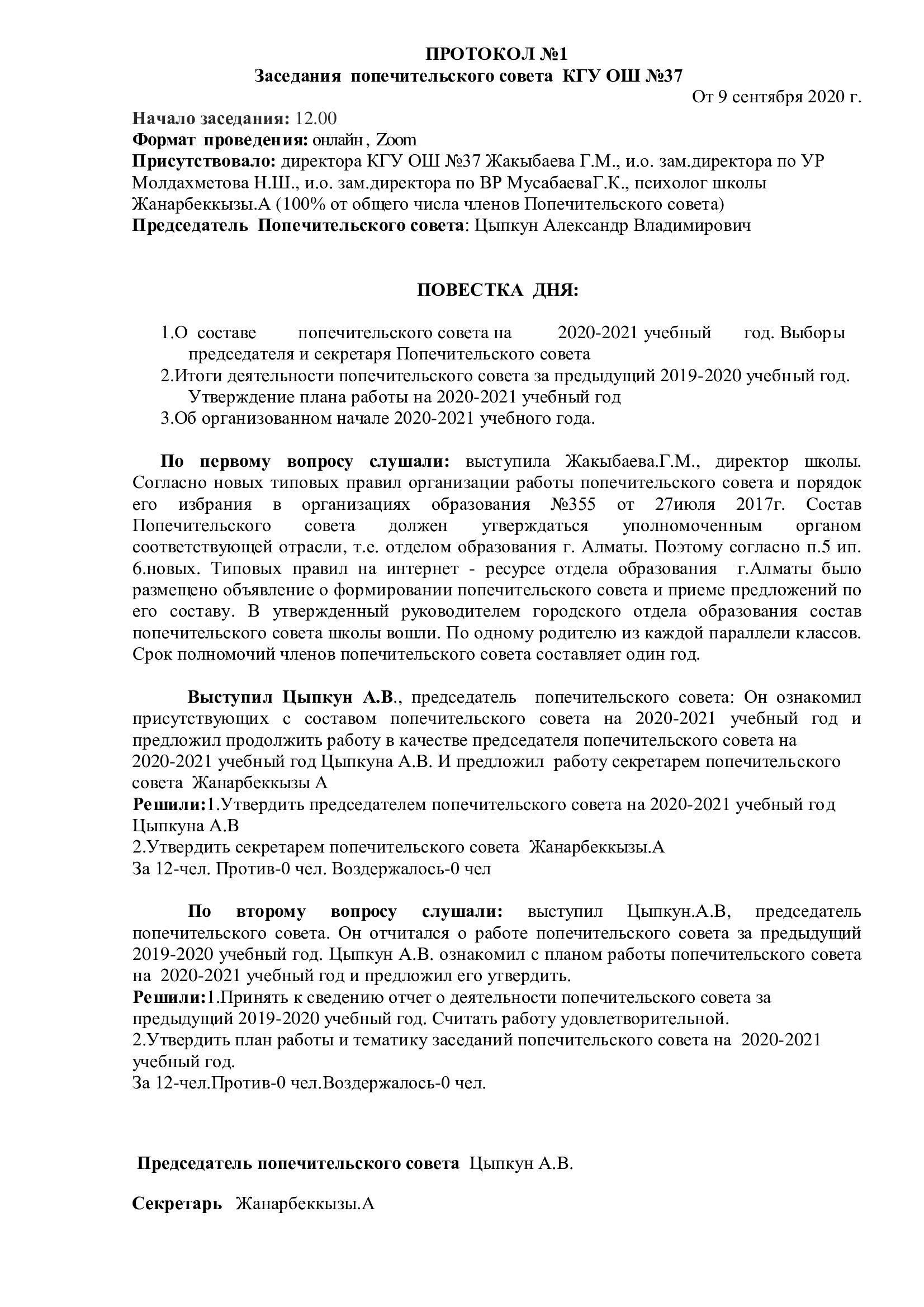 » ПРОТОКОЛ №1 Заседания попечительского совета КГУ ОШ №37