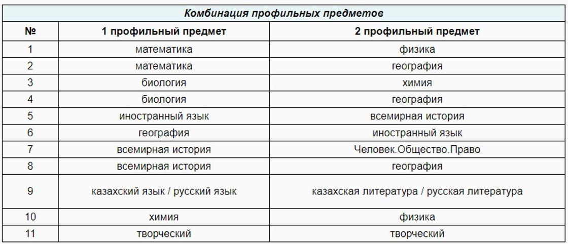 Комбинация профильных предметов ЕНТ